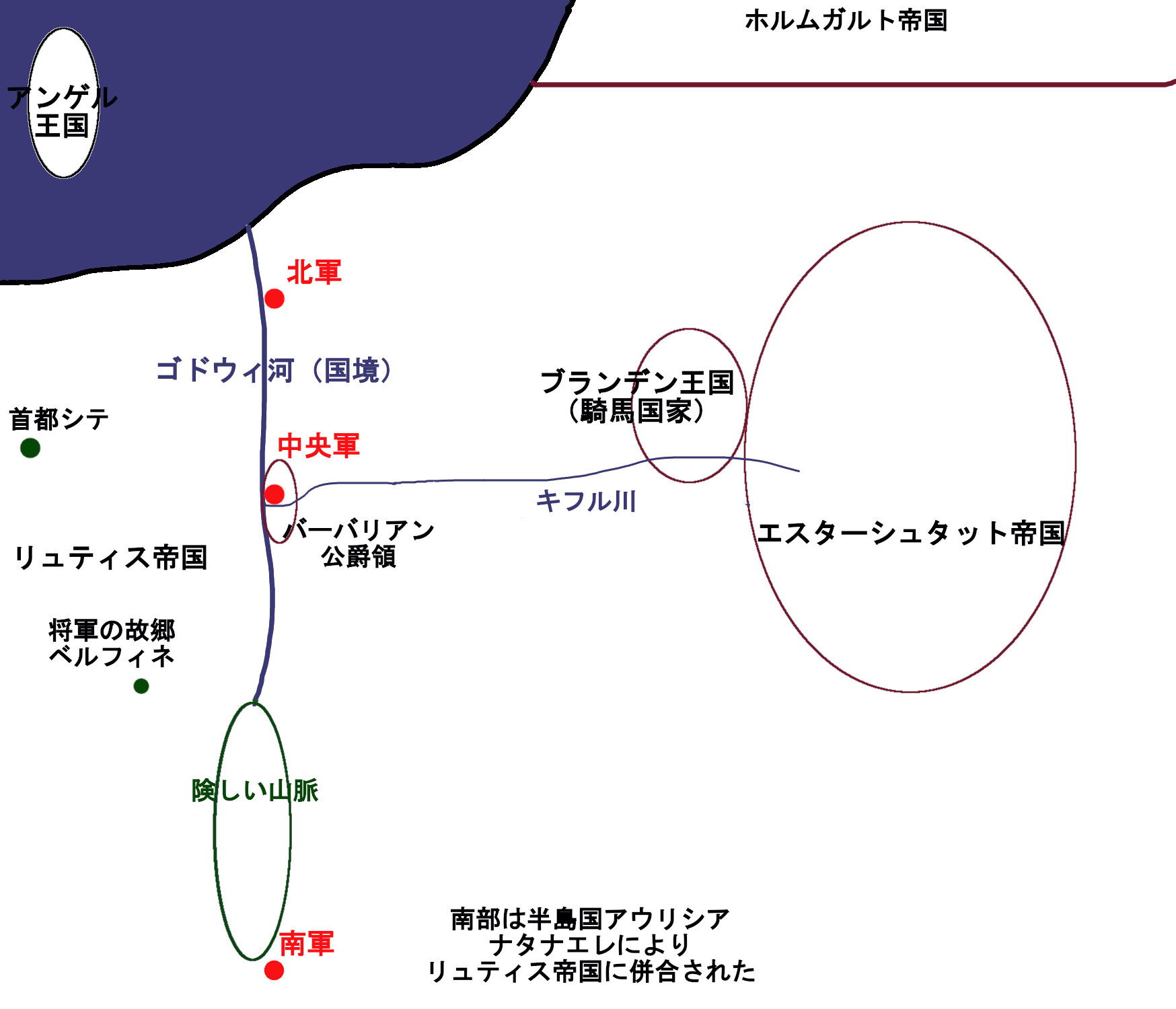 赤丸のついているのが、リュティス軍の国境駐屯軍です。