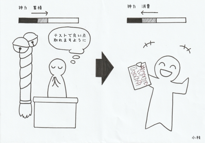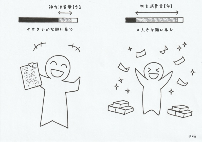 祈る回数が多ければ多い程、また、祈りの力が強ければ強い程、神力は蓄積されていき、その力によって人の願いは叶う。