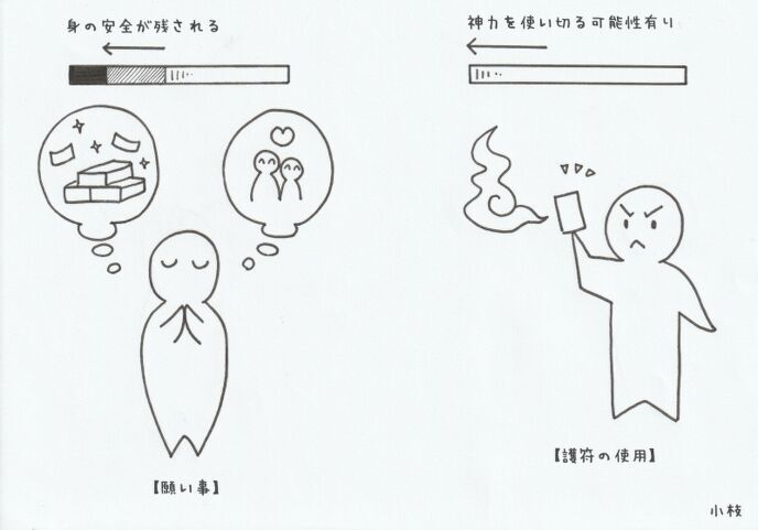 「そして護符の使用にも神力を使う。けれど神力は無尽蔵じゃない。ここで注意して欲しいのは、願い事を叶える為には最低限の健康・安全祈願に必要な神力を残して叶えてくれるのに対して、護符を使用する場合の神力消費は、そういった身の保証を残す事なく使うという事。」