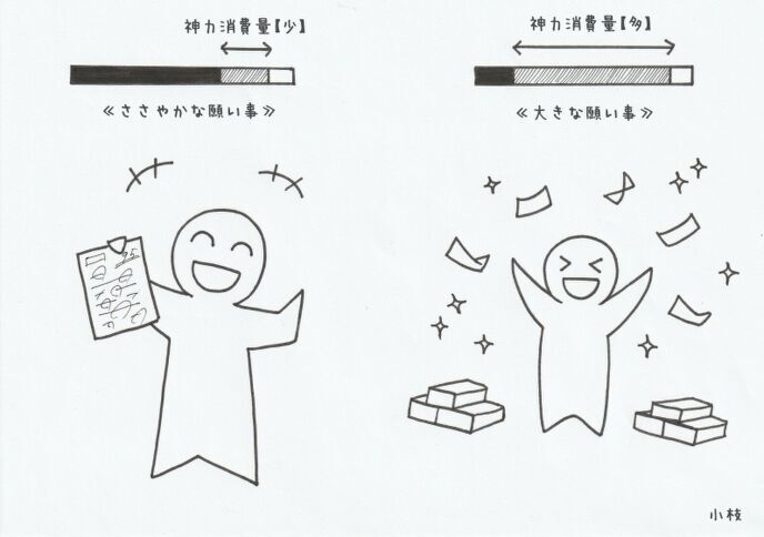 大きな願い事を叶えるのは、ゲームでいう奥義や秘奥義を使用するに値する行為らしい。(ゲージが貯まらないと発動できない、など。)小さな願い事は雑魚とのバトルでも頻繁に使用する技程度。