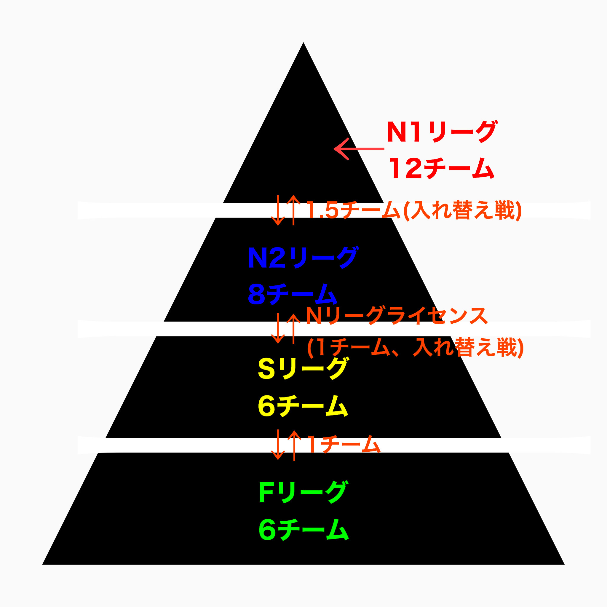 N2リーグ:8チーム、ホーム・アンド・アウェー2回ずつ総当り全24試合 最下位で入れ替え戦(勝てば残留、負ければ降格。Sリーグ王者がNリーグライセンスない場合不戦勝扱い)、優勝昇格、準優勝入れ替え戦(勝てば昇格、負ければ残留)