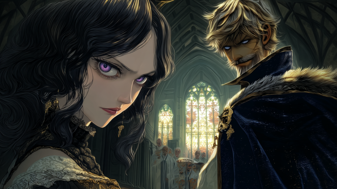 葬儀が終わり、参列者たちが一人、また一人と礼拝堂を後にしていく中、摂政レジナルド公爵が、芝居がかった弔問客のように、イザボーの前にゆっくりと姿を現した。その顔には、偽りの哀悼の表情が貼り付けられていたが、隠しきれない満足感と、そしてイザボーに対する値踏みするような、冷たい光が宿っていた。