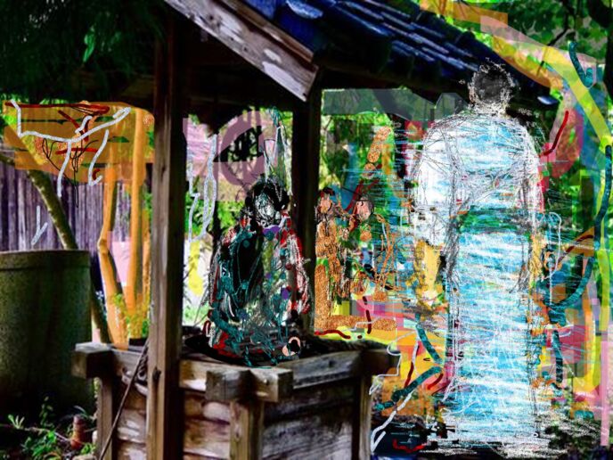 昼が近づきオカヨが山積みになった洗濯物を干しはじめた。両断斎は自分の大きな着物を物干し竿にとおし、オカヨが二人の子どもの着物を空いた場所に掛けるのを待っている。オカヨは竿を持って踏み台に上がり物干し場の竿掛けの一番上に掛けた。そんないつもと変わらない光景のなかに、いきなり悲鳴が聞こえた。