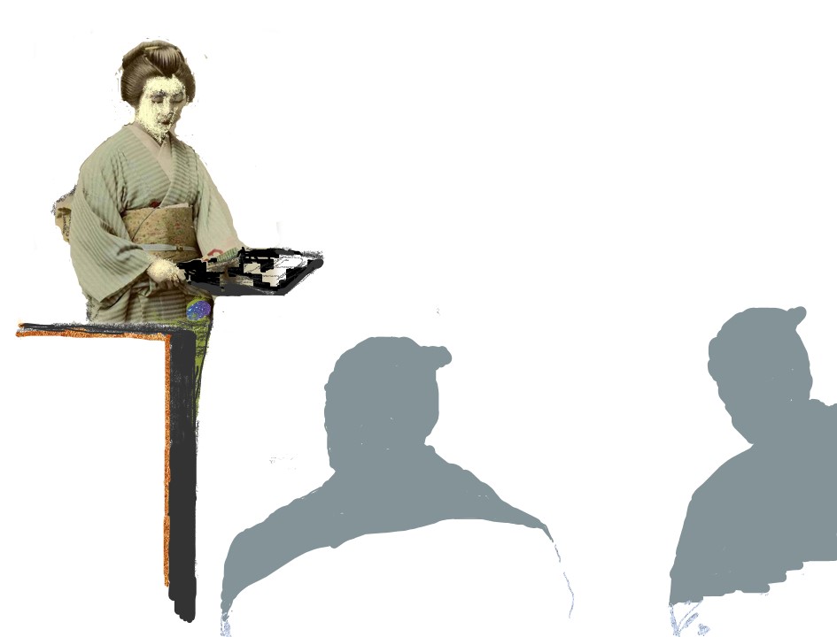 このオマツは岡っ引きの松五郎の母親である。オマツにうながされ三人が給仕場に入るとオマツはオカヨに顔を洗うように言った。オカヨは駒吉一味とのやり取りで顔が汚れていることに気づき桶を借りて顔を洗いはじめた。その横でオマツは化粧の準備をしながらオカヨが顔を洗い終えるのを待った。オカヨは言われるままに顔を拭いてからオマツの指示に従い給仕場の腰掛けにすわった。