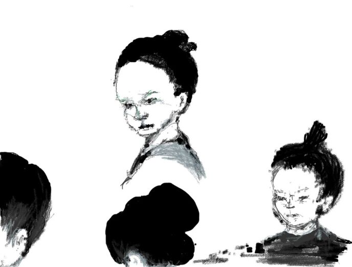 顔を洗い終えたオカヨの姿は自分で髪を丸めて櫛と玉簪でとめただけの髪型で着物は亡くなった両断斎の妻のオツタのものを着ていた。それをオマツが流行りの丸髷に変えて帯の形を直していく。オカヨの顔に白粉と紅が差されると佳乃丸とカンタが不思議そうに見ていた。