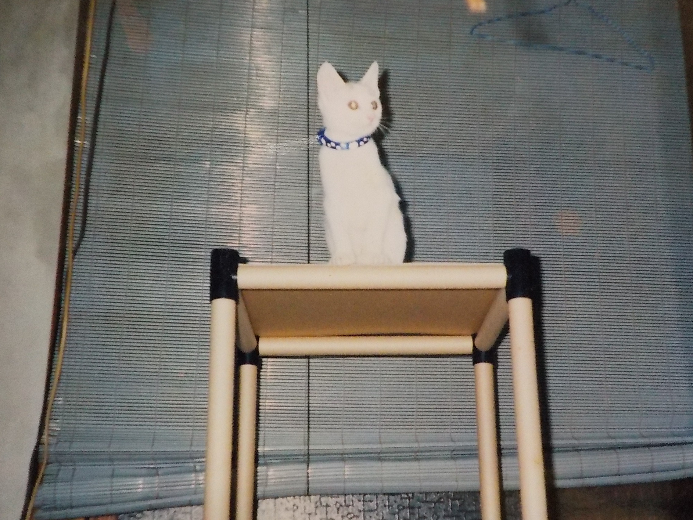 前話、手作りキャットタワーに一人で乗れた時の写真。ドヤ顔をしてます(笑)