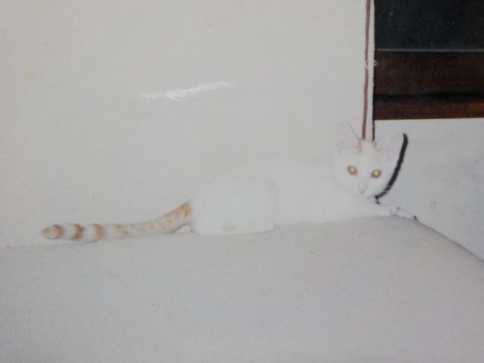 毛繕い後のまったり。ソファーが白いから、わかりづらい(笑)