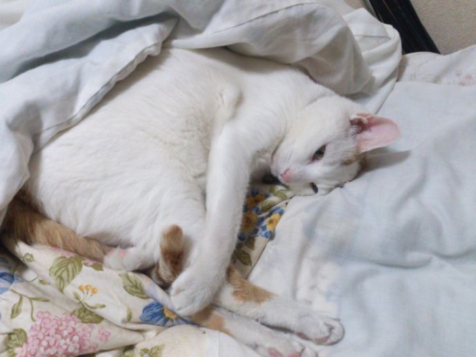お気に入りの場所は母のベッドの上と私の布団の上、ソファー。必ずどこかで寝ていて、万歳しながらへそ天で寝ている。