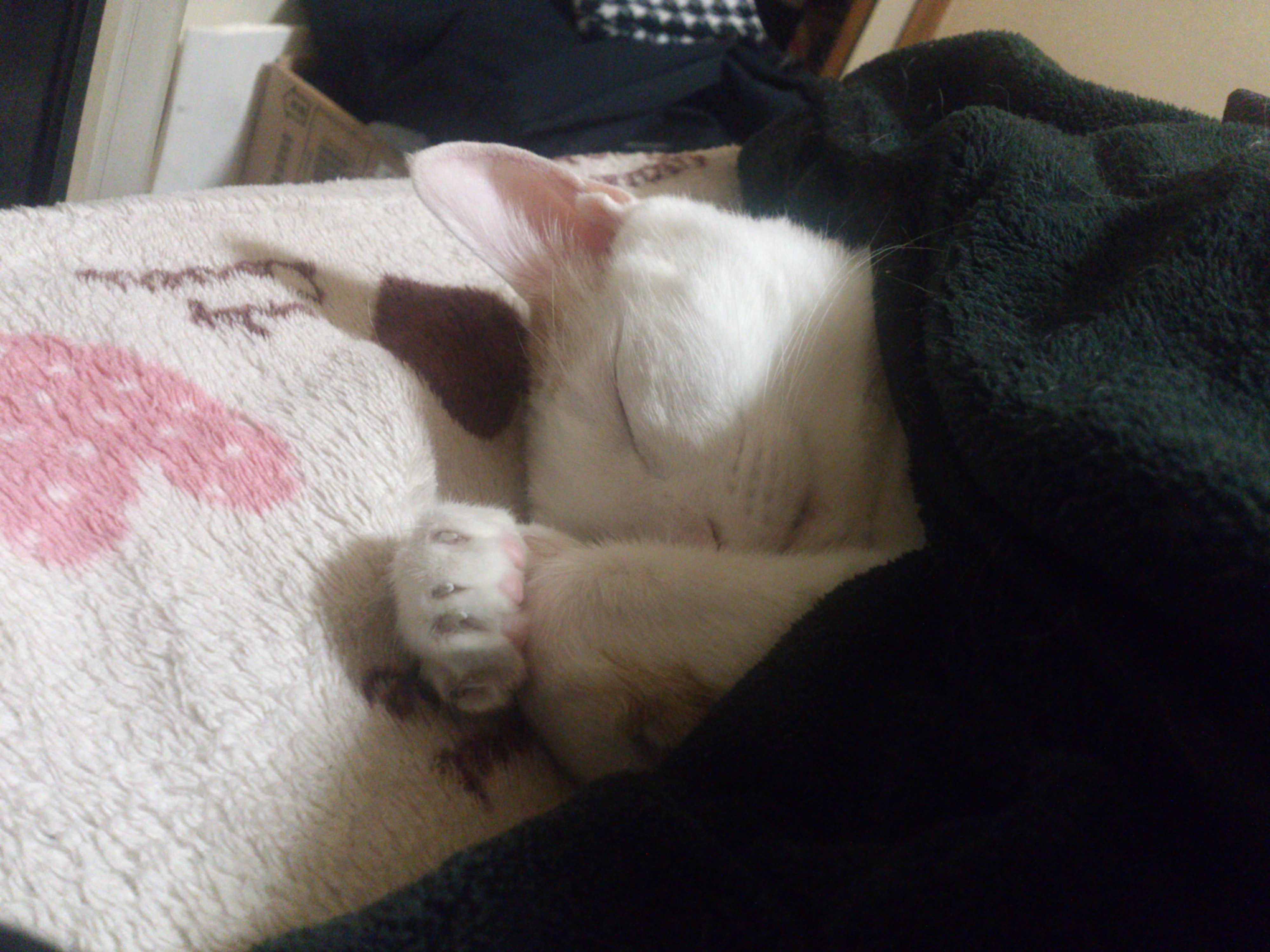来たころよりも躰が少しだけ大きくなり、自作のキャットタワーに自分で登れるようにもなってきた。と言っても、まだ最初の一段目だけ。