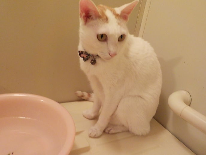 一人にすると鳴いて探すので、ひとこと「ぽちゃぽちゃしてくるね」(お風呂に入ること)と声をかけ、探す前にさっさと洗ってしまおうと思っていたんだけど、結局探しにきてしまった。