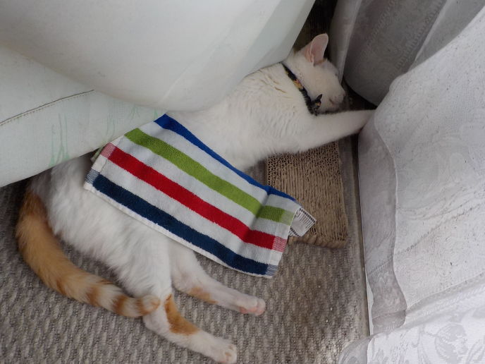 お気に入りの場所、その1。テレビ台の裏や横。ダンボールの爪とぎを枕にゴロン。お腹に乗っているのは保冷剤を包んだタオル。