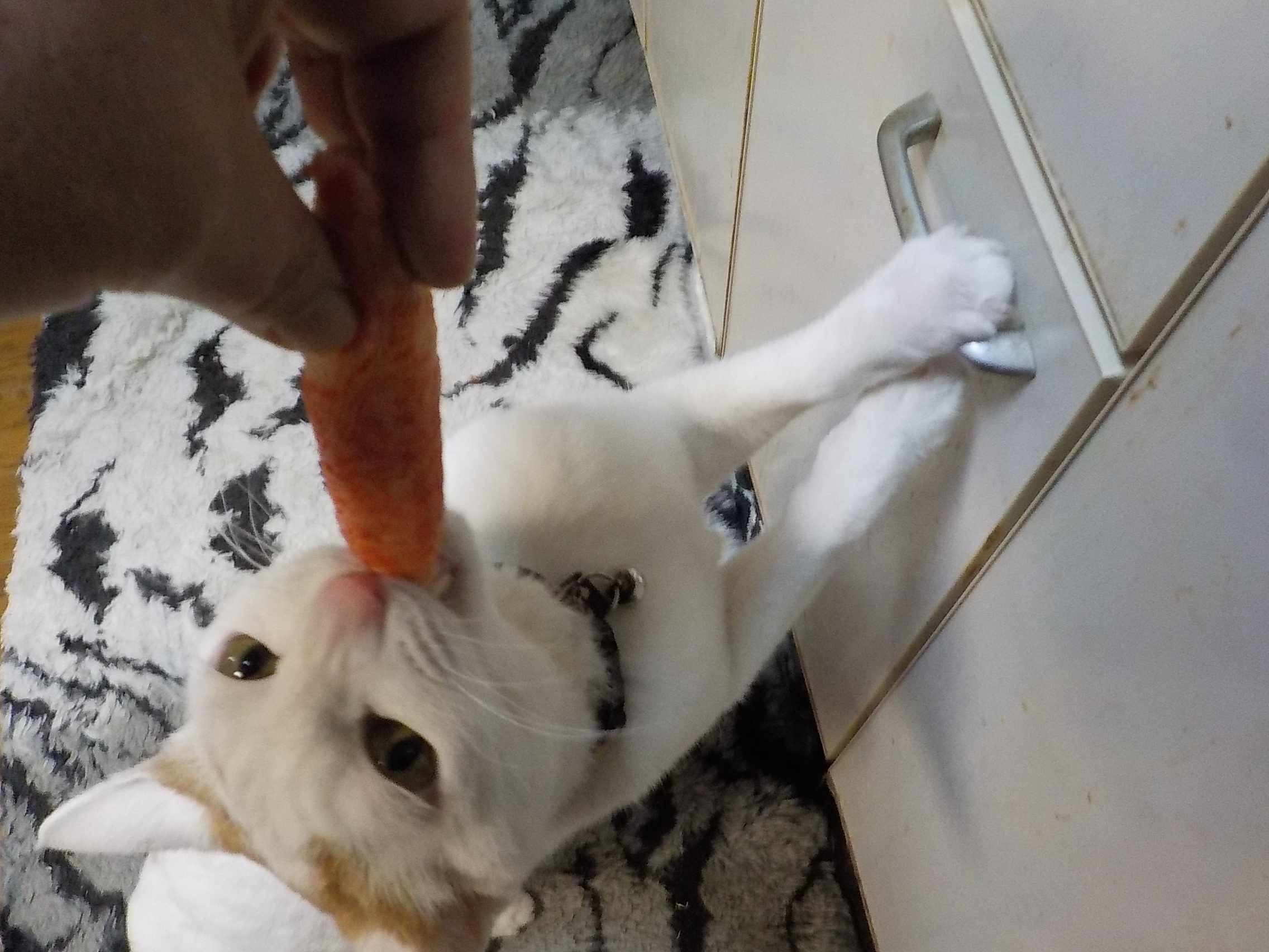 キッチンに立ち夕飯の用意をしていると、側に寄って来る。それがかにかまだとわかると、急にそわそわしだし、一本を見せるとこの有様(笑)