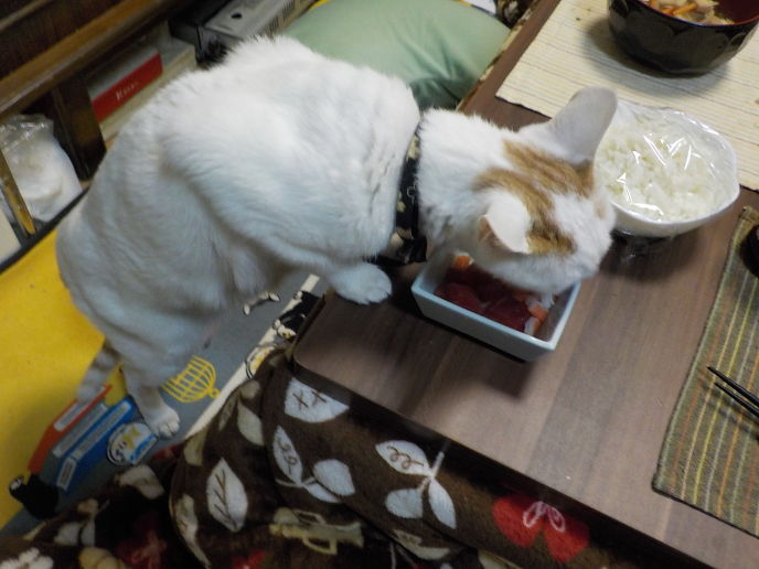 朝。私の目覚ましが鳴ると同時に起きてきて、「エビをくれ」とばかりににゃ~と鳴く。なのでさっさと起きだして食べやすいよう小さく切り、専用の器に入れてテーブルに置くと、この有様。