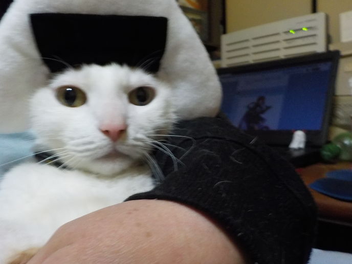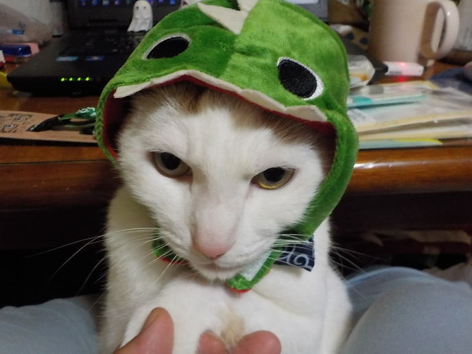 ただ、猫用とはいえ龍にとっては大きかったらしく、すぐに脱げてしまいました。いつか逆光じゃないのを撮りたいです。