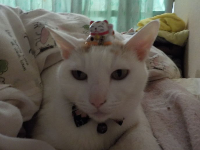 鏡餅についていた招き猫のフィギュア。逆光気味ではありますが、ついのせてしまった(笑)