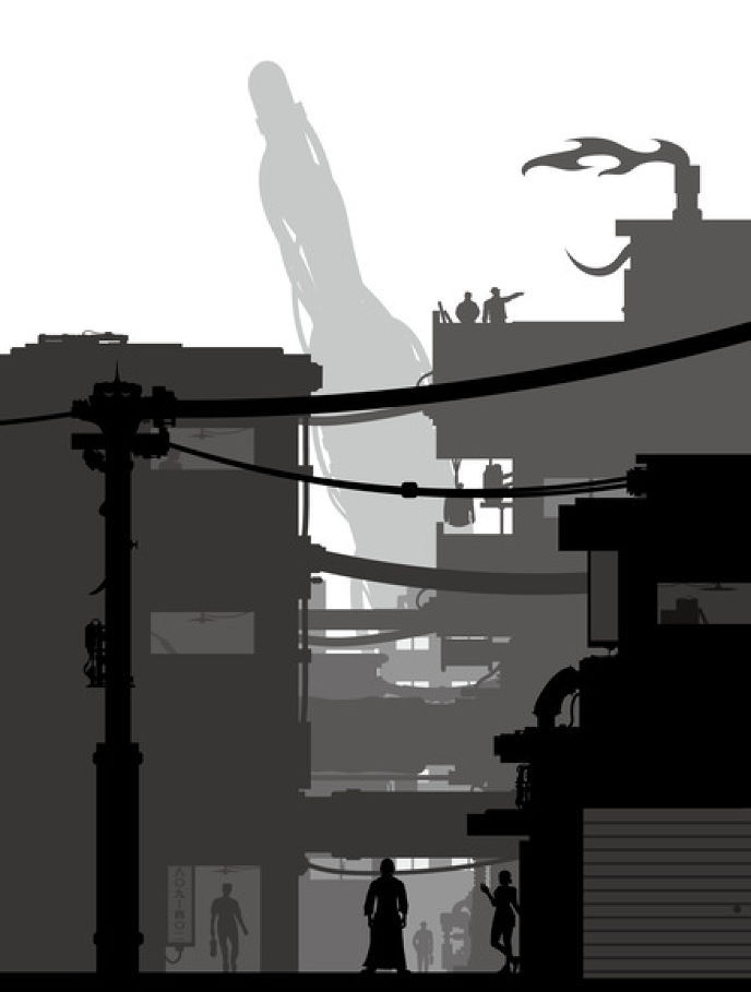 そして一番目を引くのは建物の隙間から遠くに見える、スカイツリーの倍はあろうかというコードと機械に覆われた倒れかけの不気味で巨大な塔。