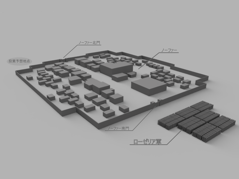 大方の予想を裏切り、ローゼリア軍はノーファーの南門前に全軍揃い布陣していたのだ。過去の戦史を紐解いてもあまり例をみない、兵法からは完全に逸脱した動きであった。