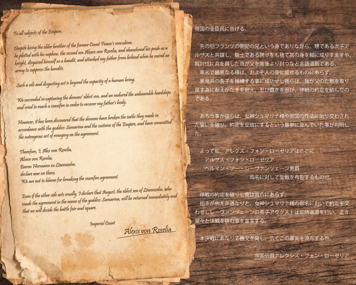 悪鬼共の長子を捕縛する事に成功せし我らは、我が父の亡骸を取り戻す為に耐えがたきを耐え、忍び難きを忍び、停戦の約定を結んだのである。