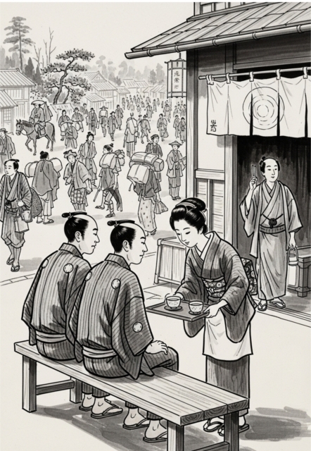 結綿の髪、黄八丈に似せた小袖に赤い帯。いかにも茶屋娘という格好のおはるは、縁台に並んで座る二人の客の間に湯呑みを二つ載せた盆を置いた。