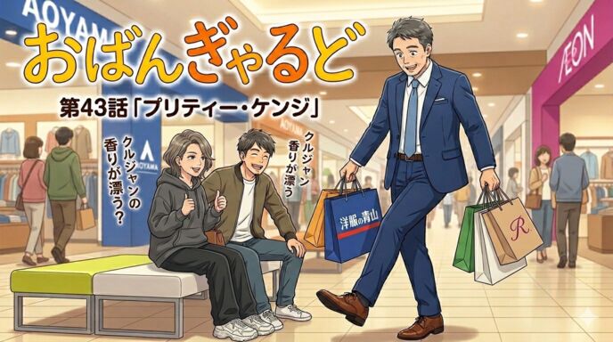 また試着室のカーテンが閉まり再び開いたそこには、今流行りの短めの丈に靴下を敢えて見せてスニーカースタイルと言うスーツ。モジモジ研二が着ると寸足らずにしか見えない。