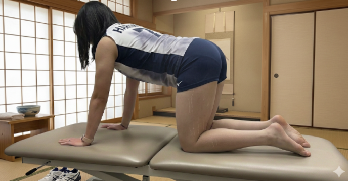 直樹が背後でゴム手袋を装着しながら、淡々と指示を飛ばす。 パチン、とゴムが手首を叩く乾いた音が、はるかの心臓を跳ねさせた。 しかし、はるかは入り口で立ち尽くしたまま動けない。エースとしてのプライド、そして乙女としての羞恥心が、このみっともない姿での「処置」を拒絶していたのだ。