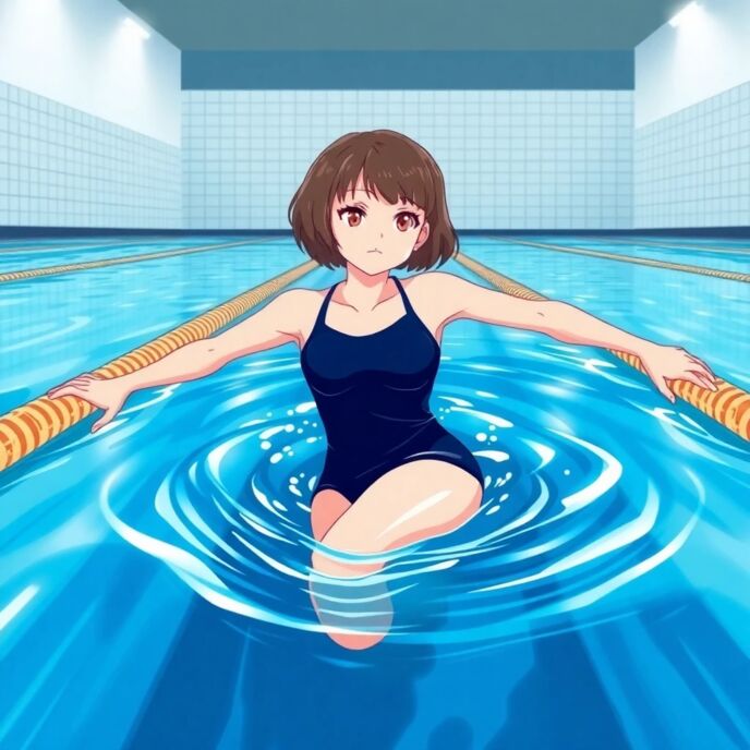 『今度はもっと速く泳ぐよ!』と目を輝かせる。その言葉にユウも笑顔を浮かべ、二人の楽しい時間は続いていく。リナの声がユウの心を軽やかにし、彼女の笑顔が彼の疲れを癒す。競泳を通じて築かれたこの関係が、二人にとってかけがえのないものだと再確認する。彼らは、競泳を離れるリナの悲しみを断ち切るかのように、心から楽しむことに集中していた。二人はクタクタになるまで泳ぎ続け、プールサイドに腰を下ろした。リナは息を整えながら、