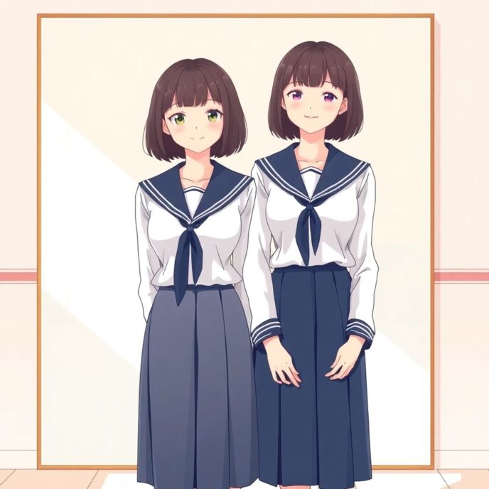 『お待たせ、ゆう』と、リナが戻ってくると、手にしていたのは二着のセーラー服だった。もちろん、それは二人が通っている高校の制服だ。ユウはその姿を見て、心が踊るのを感じた。〈あの、リナのセーラー服姿が見れる。しかも自分も妹としてそれを着る〉なんて素晴らしいことだと思えた。制服姿の姉妹になるという期待感が、ユウの胸を高鳴らせていた。リナのセーラー服姿を想像するだけで、彼女の美しさや可愛らしさが思い浮かび、心から早くその瞬間が訪れてほしいと願った。