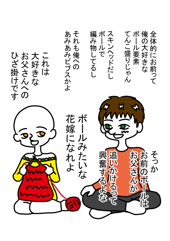 「全体的にお前って 俺の大好きなボール要素てんこ盛りじゃん スキンヘッドだし ボールで編み物してるし それも、俺へのあみあみビブスかよ」