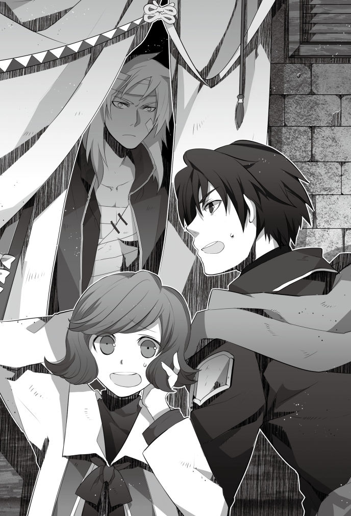 そこへ先程家の中から聞こえた声とは違う男の声が響き、頭と身体に包帯を巻いた白髪のやや大柄な若者が布扉を捲って現われた。若者の後ろには、心配そうにこちらを窺っている年輩の男性と女性の姿も見える。その二人も無技人である事を示す白髪に白瞳だった。