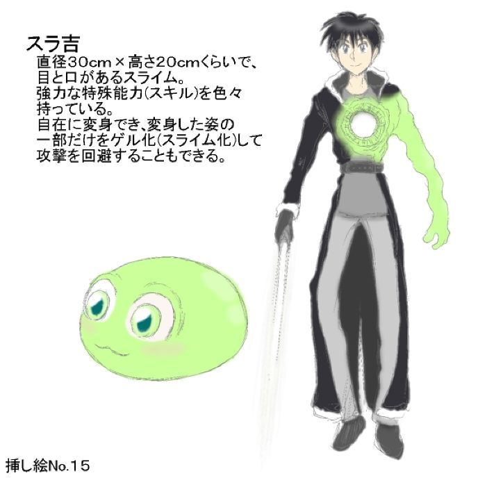 ( 「 ご苦労だったな『スラ吉』。 いくつか課題はあるけど、生まれたばかりで、初の戦闘で、オレになりきって、しかも相手が【平行世界(パラレル・ワールド)】のひとつを統べる【吸血鬼の女王(ヴァンパイア・ロード)】との戦闘で この戦いぶりはスゴイ立派だよ。 」 )