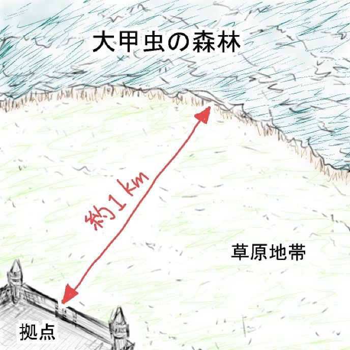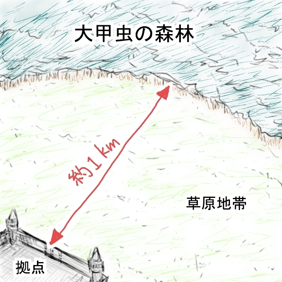 ここは『大甲虫の森林』の草原地帯…。 ( 『大甲虫の森林』は、拠点と森林との間に1kmほど距離があり、拠点と森林との間は草原地帯になっている。 )