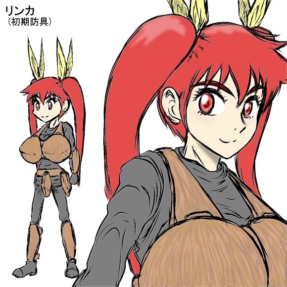 ( この初心者ハンターの名は『リンカ』。 腰のあたりまで伸びた赤毛のツインテールの根元を黄色いリボンで縛っている。 目は大きく、ややツリ目だ。 身長は160cmほどで、胸は大きい。 防具は、身体にぴったりフィットしたグレーのボディースーツの上から、胸宛て、腰宛て、(手首から肘にかけての)腕宛て、脛宛てを身に着けている。 これらの防具は、古い十円玉のような、くすんだ銅の色をしている。 また、右手には刃渡り70~80cm程の銀色のショートソードを、左手には直径50cm程の銀色のラウンドシールド(円盾)を装備している。 )