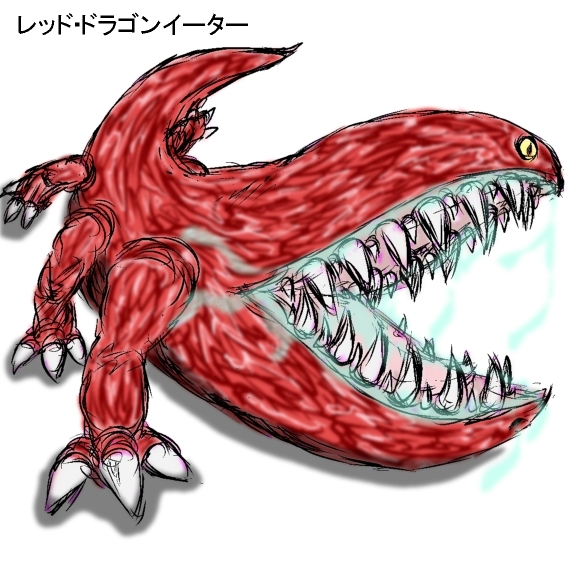 ( 一方の巨大モンスターは名を『レッド・ドラゴンイーター』という。 オタマジャクシのような体型をしているが、口は大きく裂けており、なんと身体の3分の1ほどが口であり、大きくあいた口には巨大な牙がずらりと並んでいる! 口が全長の約3分の1、胴体も全長の約3分の1、尻尾も全長の約3分の1…といった比率だ。 そして、通常の動物であれば上顎(上唇)付近に鼻があるものだが、このモンスターの場合は本来 鼻があるべき位置には蘭々と黄色く輝く目が付いており、下顎(下唇)の付近に鼻がついていた。 これだけでもかなりの異形なのだが、更にこの生物には(通常の動物と異なり)左右に3本づつ…計6本もの脚が付いていた。 体表は、固まりかけの溶岩のような若干黒ずんだ赤い色をしている。 そして、最も特筆すべきはそのサイズだろう。 尻尾まで含めた全長は50メートルほどもある! 数ある大型モンスターの中でも大きい部類に入る。 『ドラゴンイーター』(竜を食う者)という名前は伊達ではないということだ。 )