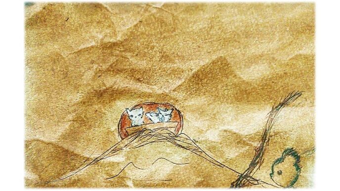 テディが、洞窟の前で、立ちすくんでいると、洞窟の中から木箱に乗った親子連れの猫が、出て来ました。