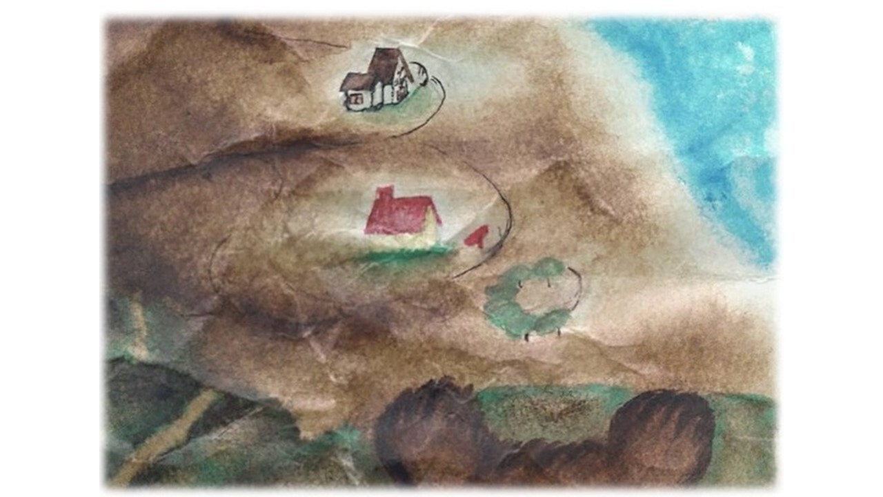 テディは、お日さまに負けまいと、いつもの坂道を登って島で一番高い場所にあるブルーベリーの丘を目指します。