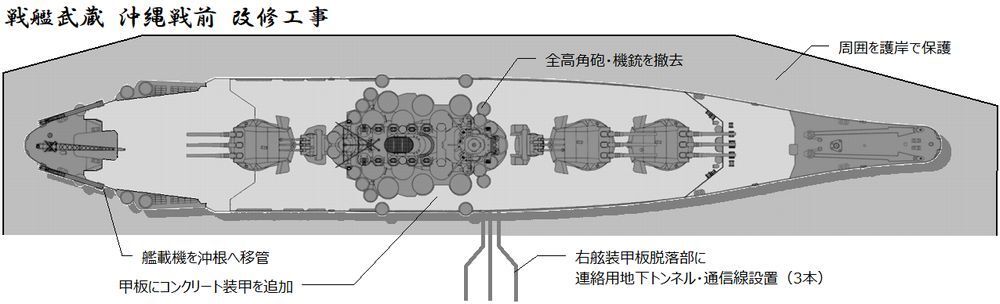 このため右舷の被雷箇所、被雷と座礁の衝撃で装甲板が脱落し空いた穴を利用して武蔵と地上を地下トンネルで接続する事とした。
