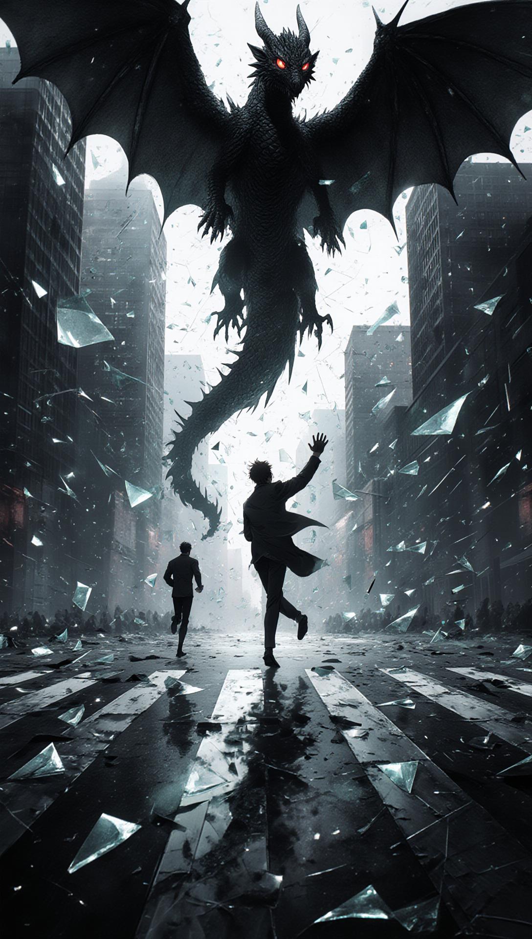 降り注ぐ無数のガラス片が、真昼の消えた太陽の代わりに、街を不気味に乱反射させる。