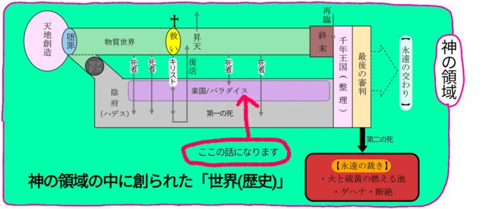 人の罪によって「 死と陰府」が 生じましたが、「たとえ、女たちが 忘れようとも、わたしがあなたを 忘れることは決してない」と 語られる「神」は、 生み出した「人( 人類)」が陰府に 降って「死と 滅び」に飲み込まれる日が来るのを、無関心に 見過ごすことはされませんでした。陰府の中に「 楽園(パラダイス)」を 設けて下さったのです。……と 言っても、「神は 陰府に楽園を 設けられた」なんて聖書の 言葉はありませんので、これはあくまでも 私の考察からの 理解ですけどね。