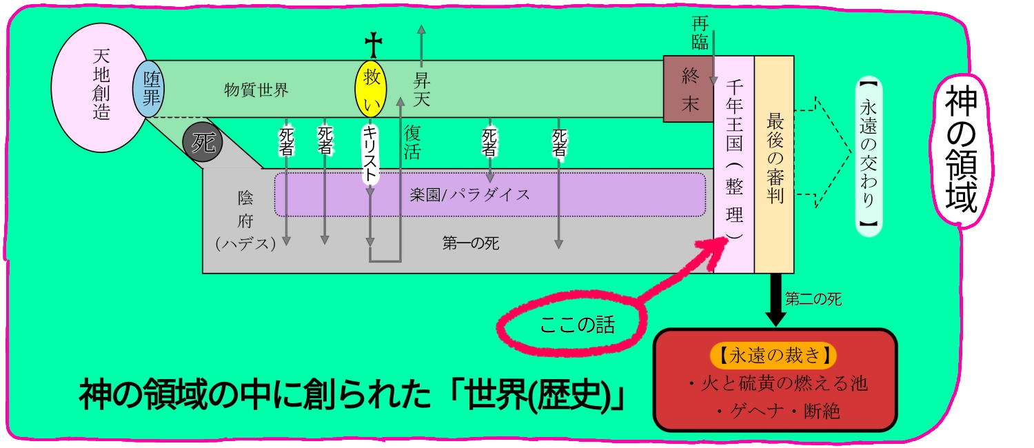 キリストと 共に、「この世界」を 千年の間統治するために 選ばれた人々が、 陰府(楽園/パラダイス)からよみがえります。その「 統治」とは、すなわち「 人」が「神」から 委ねられていた使命を 果たす「正しい支配」の期間です。「 罪」によって在るべき「良き姿」を 荒らされてしまった「この 世界」ですが、キリストと 共に正しく治める者らにより、ついに「 在るべき良き姿」へと 回復されるのです。(イメージとしては、 散らかった部屋の片付けを 選抜メンバーでお手伝いするって感じですかね……)