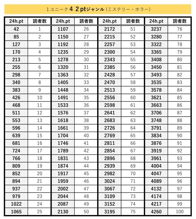【 読者数確認早見表 】42pt作品(ミステリー・ホラー)用