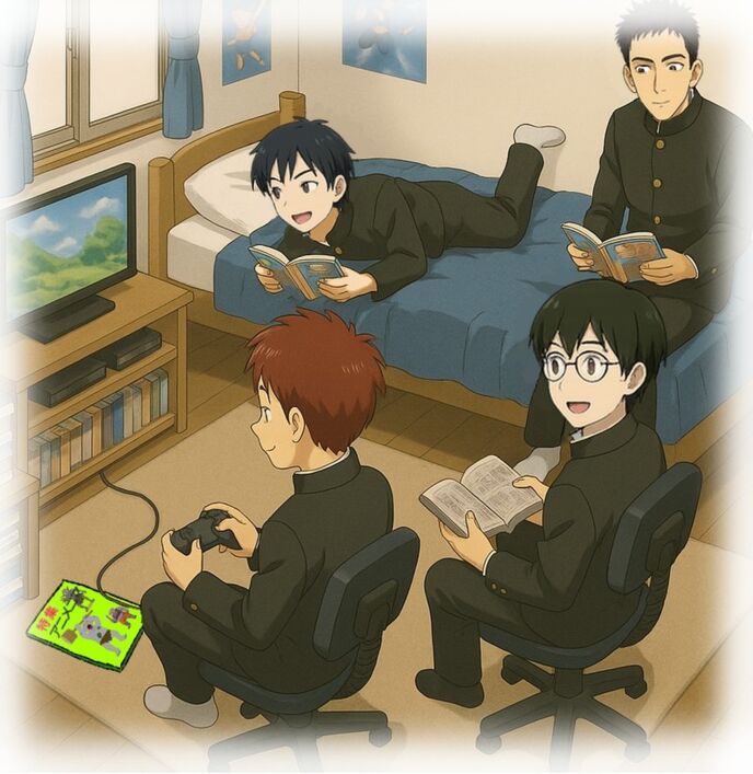 相沢卓也の家で過ごしたいつものボーイズ。そう言えば卓也の部屋のアニメ本に……