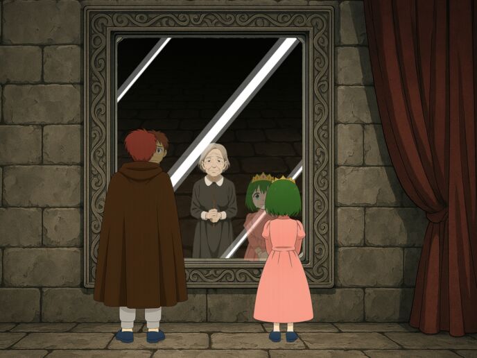 2000年前のミシュバットで妖精王を縛り付けていた「導く者の杖」を手に、水晶鏡の中から語り掛ける渋谷しず。「お願いね……遥……かが……」しずの姿が消えた鏡の前で、篤樹は足元に畳んで置いてある古い布切れに目を落とした。