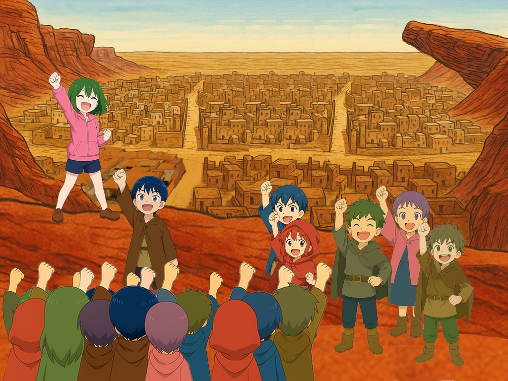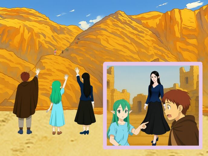 「賀川は2番、兄さまが1番や! さ、みんなぁ! 王様の誕生シーンを見つけにいくでー!」「オー!!」遥と20人の妖精達は、元気一杯に飛び上がって掛け声を上げると、ミシュバット遺跡に背を向け、王が生まれる森を目指し駆け出して行った……