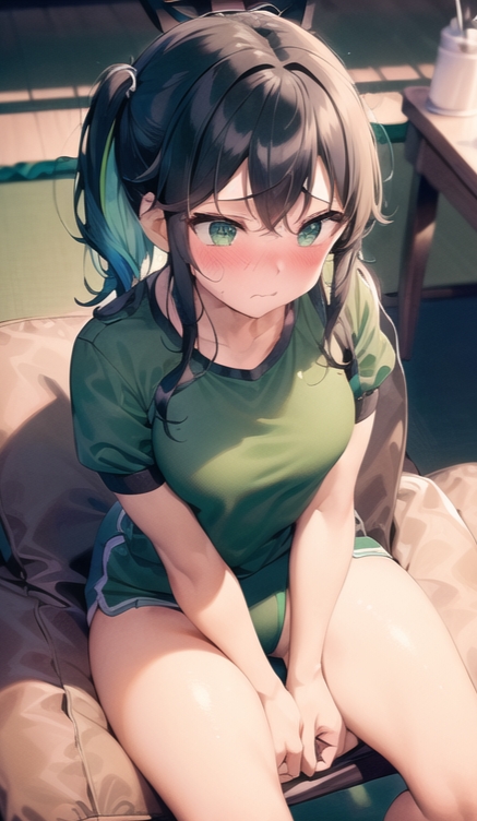 着替えて椅子に座った亜沙美は、股を閉じ腕を足の間に格納していた