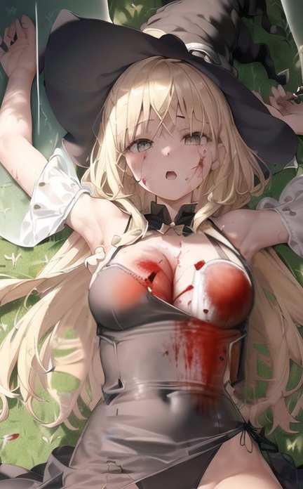 ミアナは半機械少女ジェニファーに刺された左胸から大量出血をしており、彼女を象徴する魔女っ子衣装が紅く染められていた