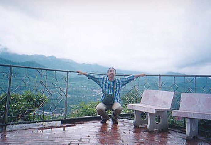 プーシーの丘の上の僕です。雨上がりのモヤが少しかかっていました。