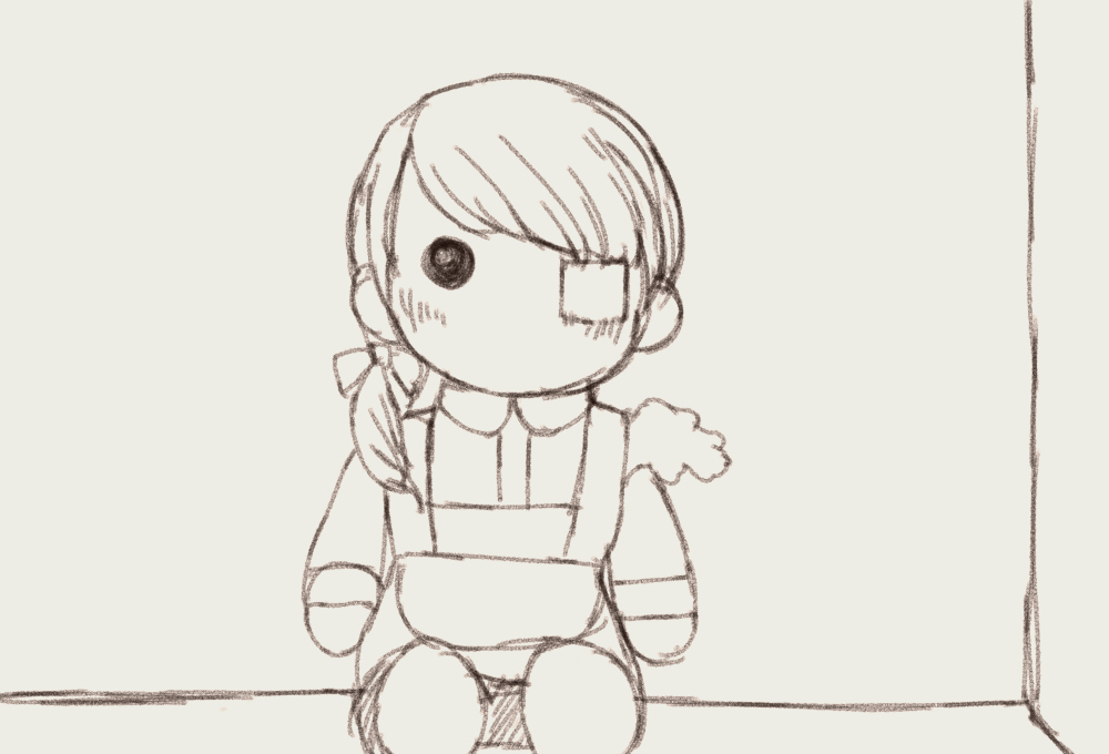 片目にばんそうこうを貼っていて、肩からは綿がはみ出しています。