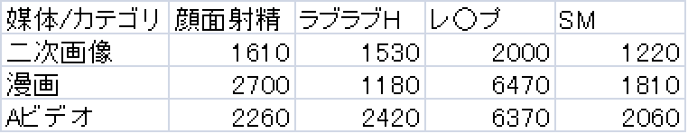 「レ○プ(強制)」と「SM」の平均値が「顔面射精」を二次画像で同値、他2媒体で有に超えている。