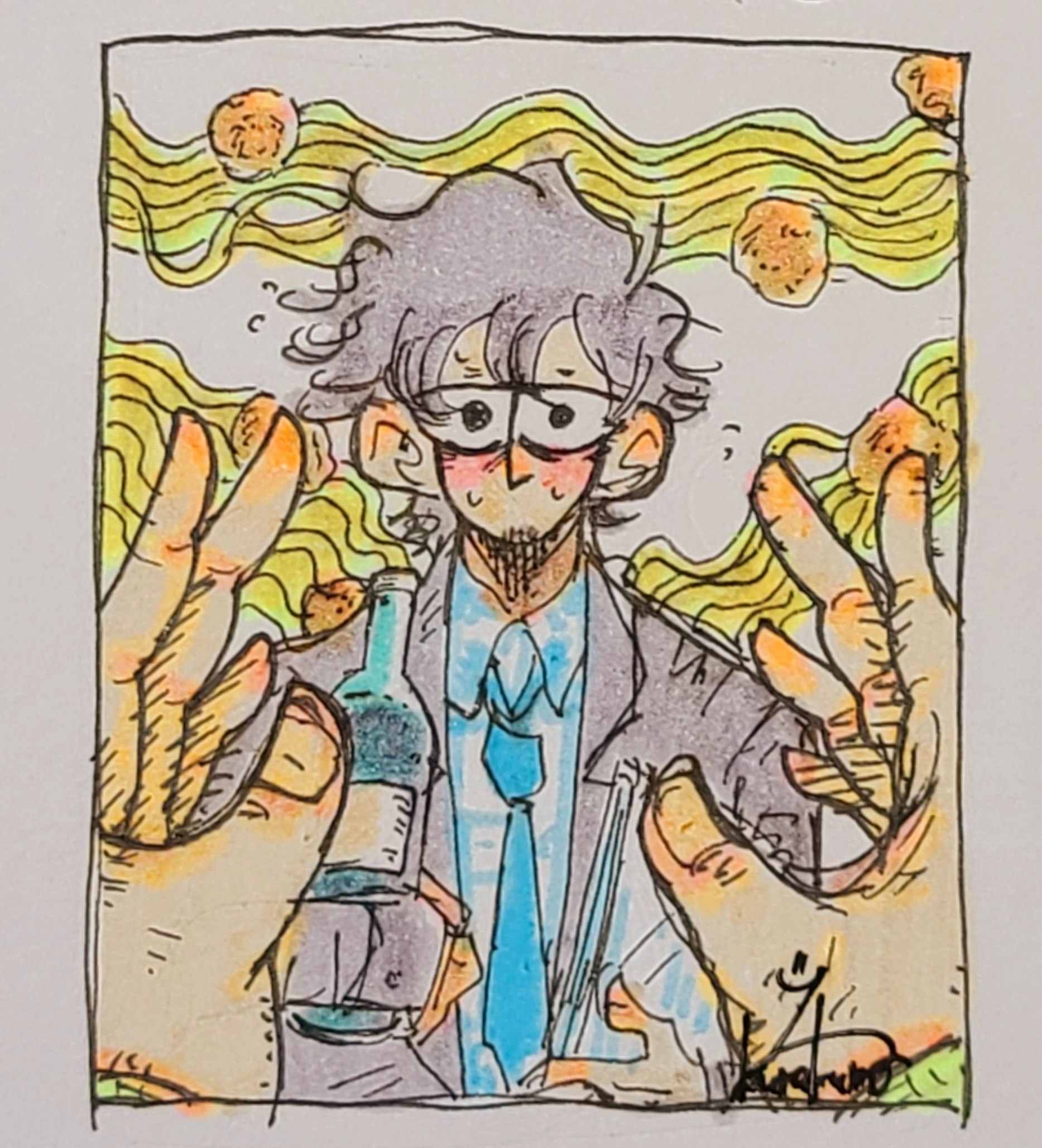 フィルは慌てて火を止め、溜息をついた。もう何十分も鍋の前にいたらしく、セーターの下はしっとりと汗をかいているし、鼻唄を歌い続けていた鼻はむずむずする。鍋の中のパスタは揺らめきながら底へと沈んでいき、重なり合って動かなくなった。