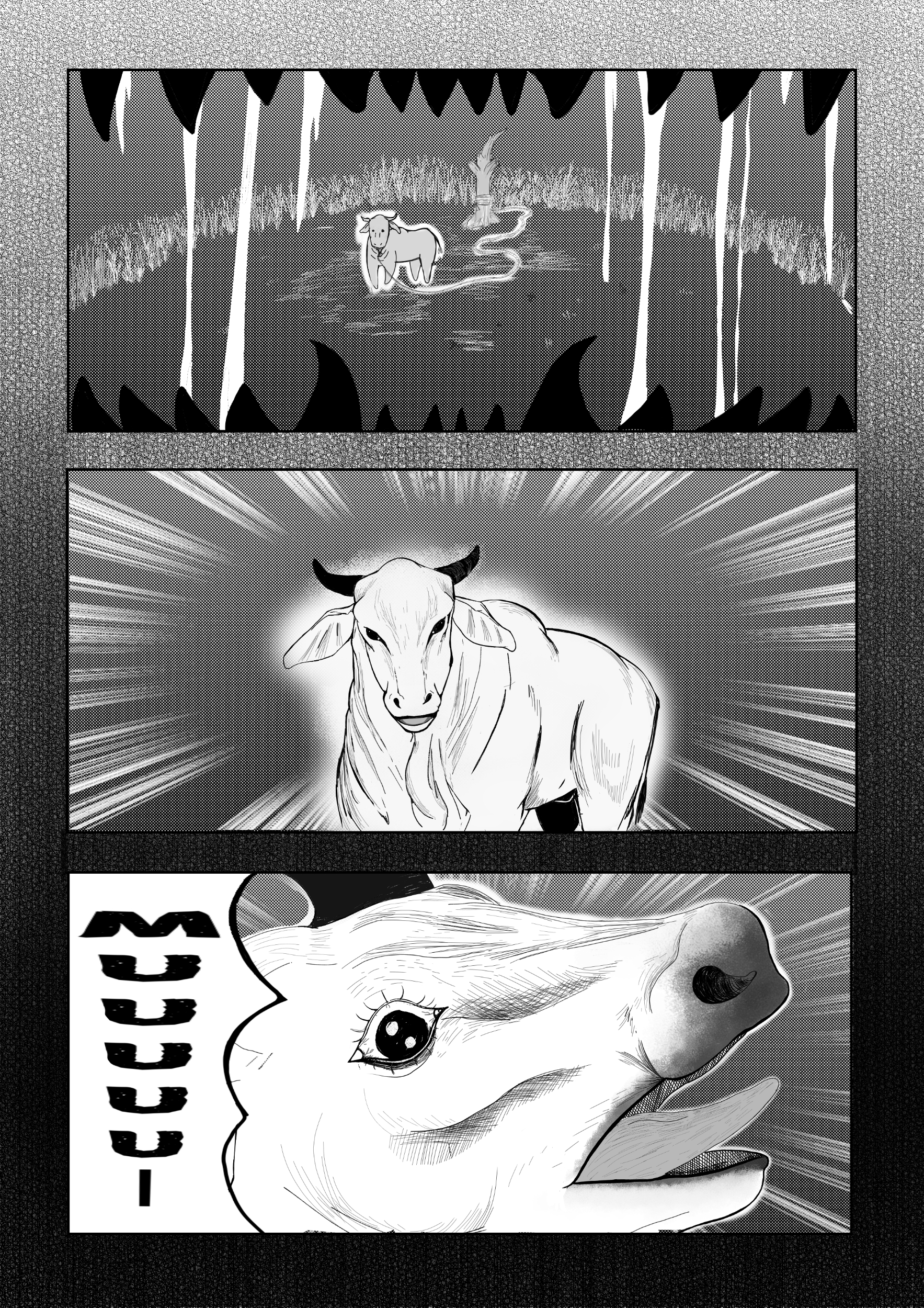Para su fortuna de la "criatura" no sentía esa fuerza que le impedía acercarse al solitario vacuno, mientras el bovino solo podía mirar de terror entre el follaje del zacate verde como se acercaba sus grandes fauces que iban cada vez mas rápido hacia el, su destino ya estaba marcado, no podía escapar al estar atado entre una cuerda y el tronco seco de un árbol, dándole su sanguinario final.